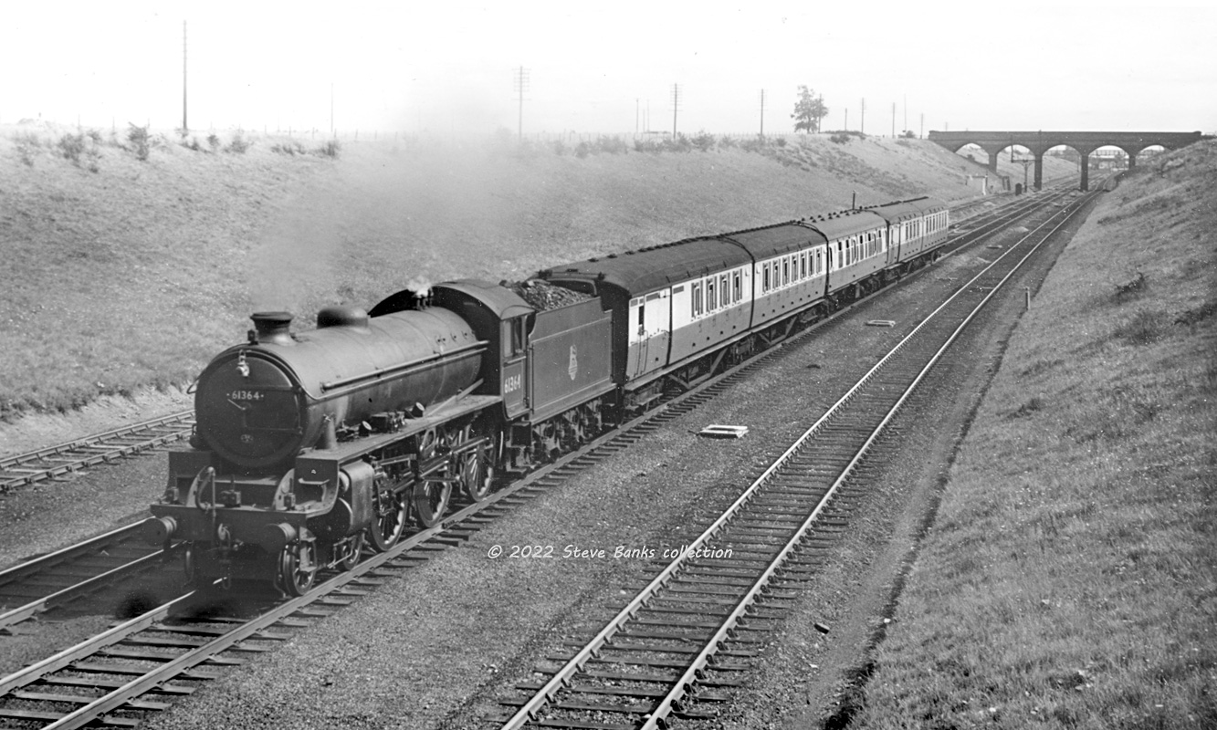 B1 No 61364 at an unknown location in the early 1950s is carrying Ordinary Passenger lights and a slightly untidy SQS in which the trailing twin is inside out. The composite in the middle with the 1st class seats has been modernised by a BR Mk.1 coach. Photo: author's collection.