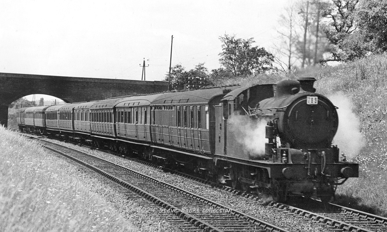 This picture sits in the section about GCR non-ganwayed carriages and has been published with a made-up caption of a "semi-fast" train but is actually an excursion employing secondary stock, as was so often the case. Hauled by Parker Class 2A No 708, it's passing Abbey Lane sidings between Nottingham and Leicester, details to follow. Photo: authors collection.