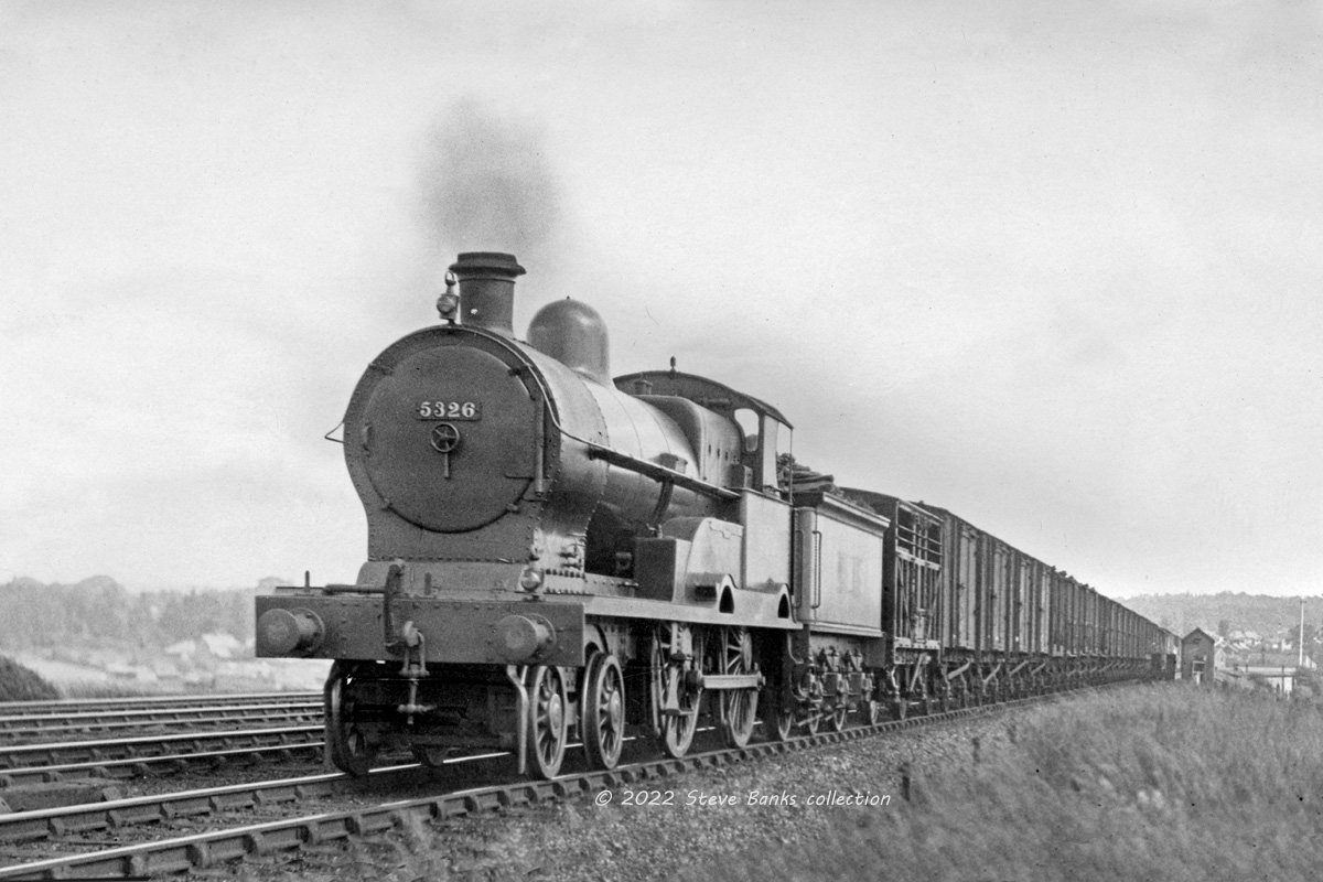 Ex-LNWR King George V class 4-4-0 No 5326 W.C.Brocklehurst is seen c1937 near Watford with a Down Class A goods train. Much of the front end of the train comprises vans and container trucks and, behind the tender, a single ex-MR/LMS cattle wagon. It would have been vacuum braked or through piped. Photo: Author's collection.