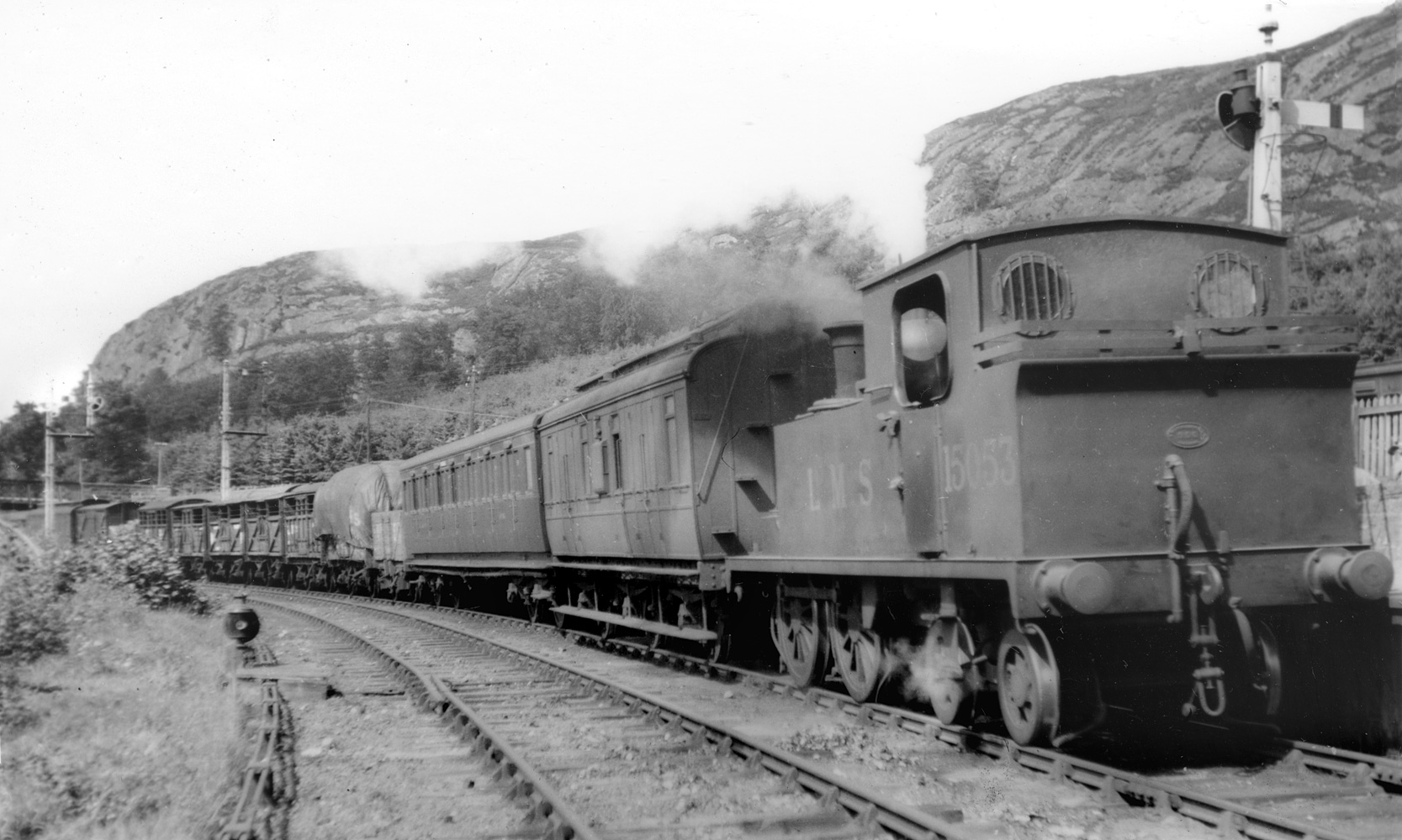 The Dornoch Branch on the former Highland Railway is well known for the operation of mixed trains and in this view from 1936, ex-HR 0-4-4T No 15053 is at The Mound with a fine example. Behind the (ex-MR?) 6w passenger brake van is an ex-HR lavatory composite.