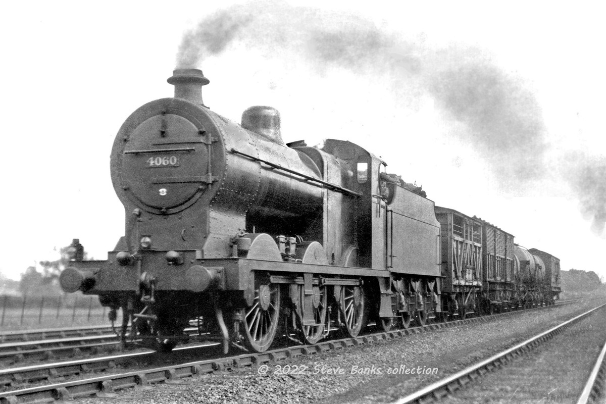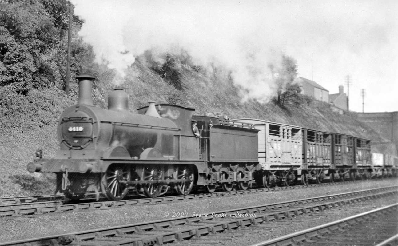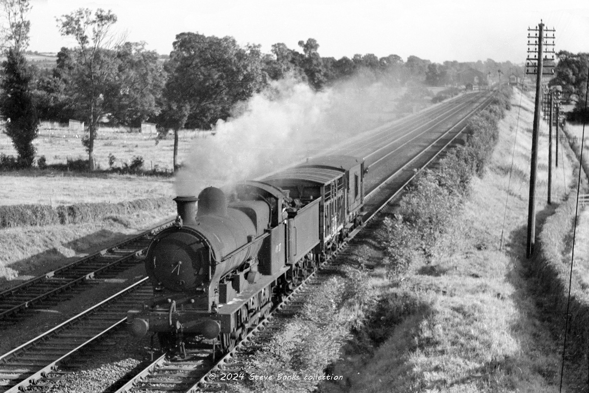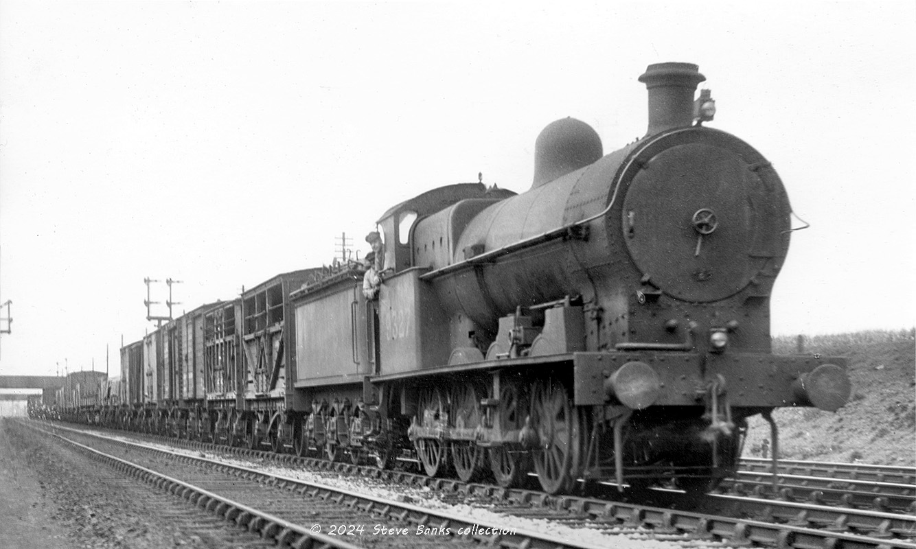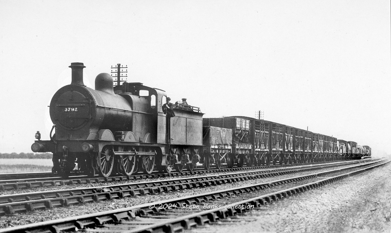 At an unknown location on the Midland four-track, ex-MR Deeley 3F No 3792 has a Class C Through Freight. Included is what looks like a raft of 10 empty cattle wagons of pre-Grouping LMS designs, ex-MR and ex-LNWR, probably being taken to a cattle market. The photo is undated but I would say that it's c1925-30 because only faint traces of the limewash remain on the lowest timbers several yeas after its replacement with phenol solution.