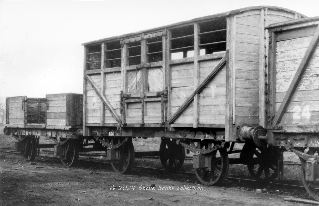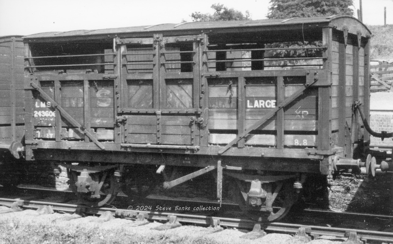 An early LMS cattle wagon, manually braked on grease axleboxes. At an unknown location carrying letters that I cannot make out: NxST? Photo: Author's collection.