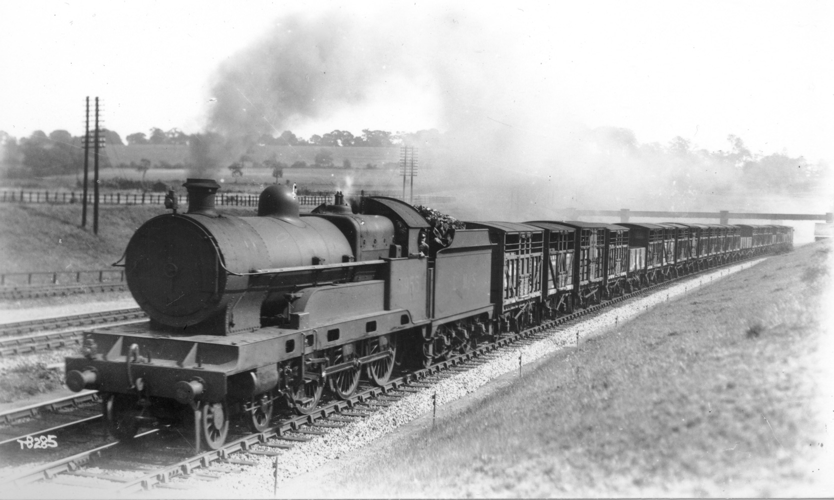 MR Kirtley 1F No 2773 has a six-wagon cattle train in 1921 near Wigston, mostly ex-MR designs. Use of limewash is heavy and the wagon livery, possibly in accordance, is quite pale. Photo: Real Photos.